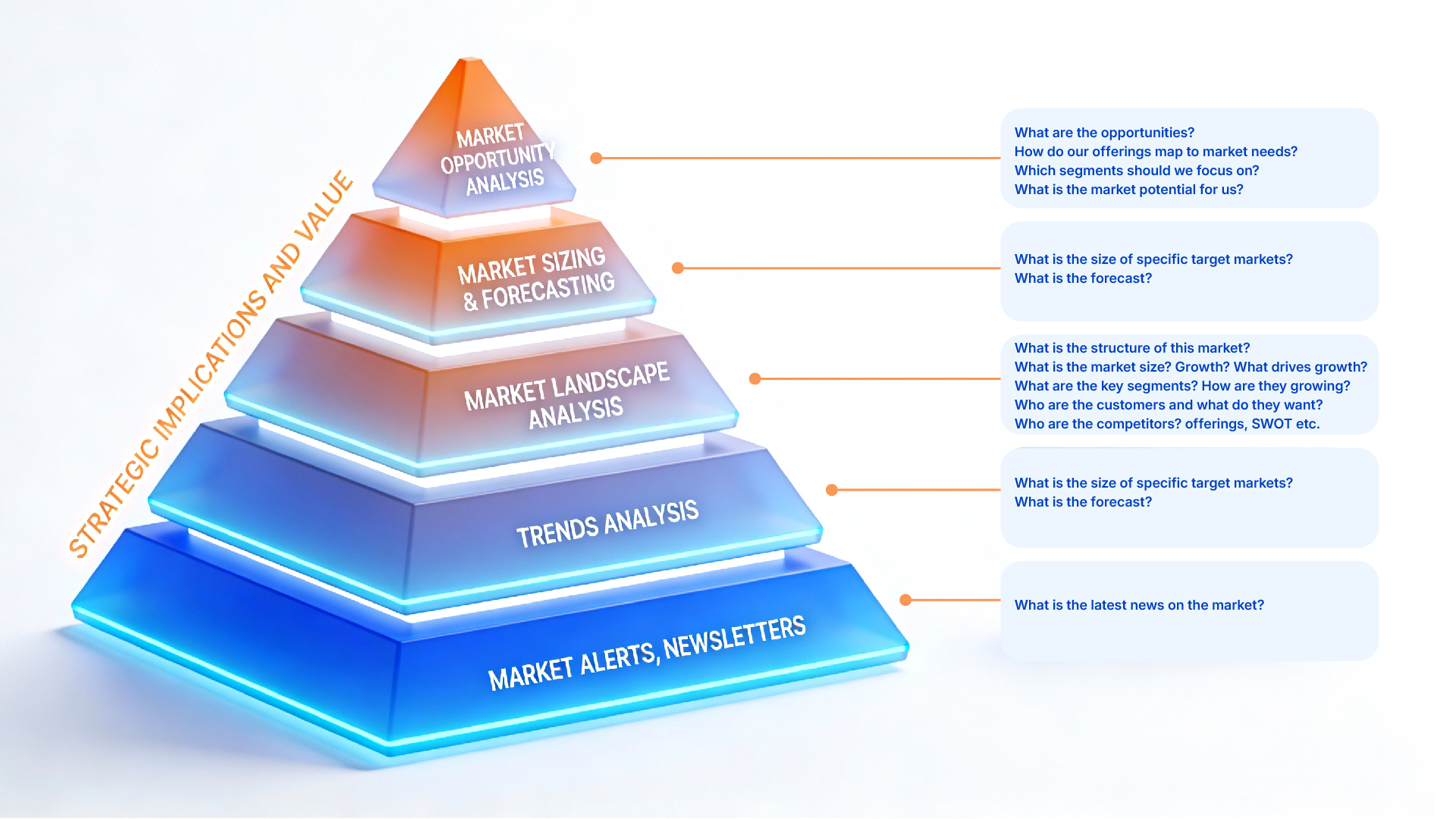 We don’t rely on one-dimensional data. Our approach blends primary research, desk research, social listening, and internal intelligence to build a 360° view of your opportunity landscape. We specialize in information synthesis—connecting dots across sources to deliver insights that are not just comprehensive, but immediately actionable.